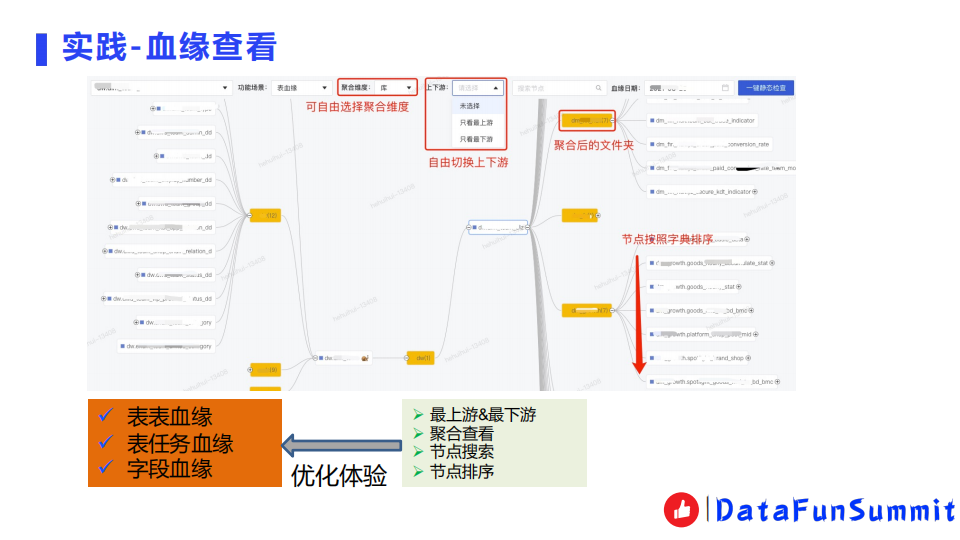 可以自由查看数据的血缘。数据血缘的种类比较丰富,包含表表血缘、表任务血缘、字段血缘。表的上游或下游个数都会很多,这种情况下想要找到用户比较关注的上下游就会比较困难。有赞做了很多优化的体验,最上游&最下游的快捷方式,为用户提供只看ODS层、业务层最上游的表或只看最下游的表;聚合查看,满足当上游或下游个数非常多的情况下,按照库、owner、数据类型、表类型进行聚合,快速查看用户关注的表;节点搜索,针对节点进行关键词搜索;节点排序,按照表名的字典顺序进行排序,有助于用户快速定位表。