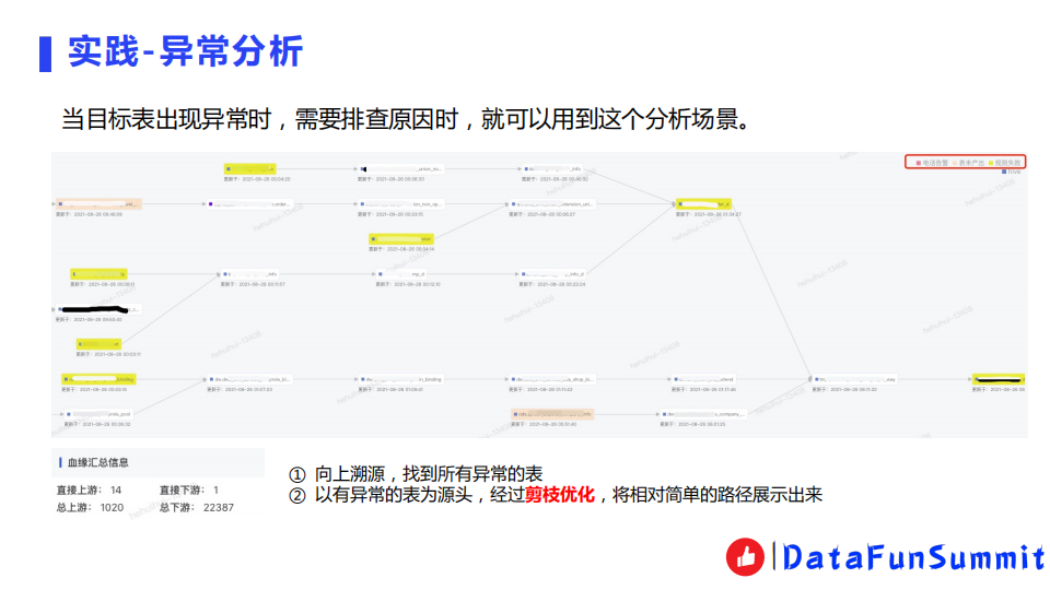 异常分析,当目标表或业务表出现异常时,需要排查原因,就可以用到异常分析的场景。当前异常会分三种情况,电话告警、表未产出、规则失败。在发生异常时,需要以目标表为源头,向上溯源找到所有有异常的表;以有异常的表为源头,经过一些列的剪枝优化,将相对简单的异常路径展示出来。