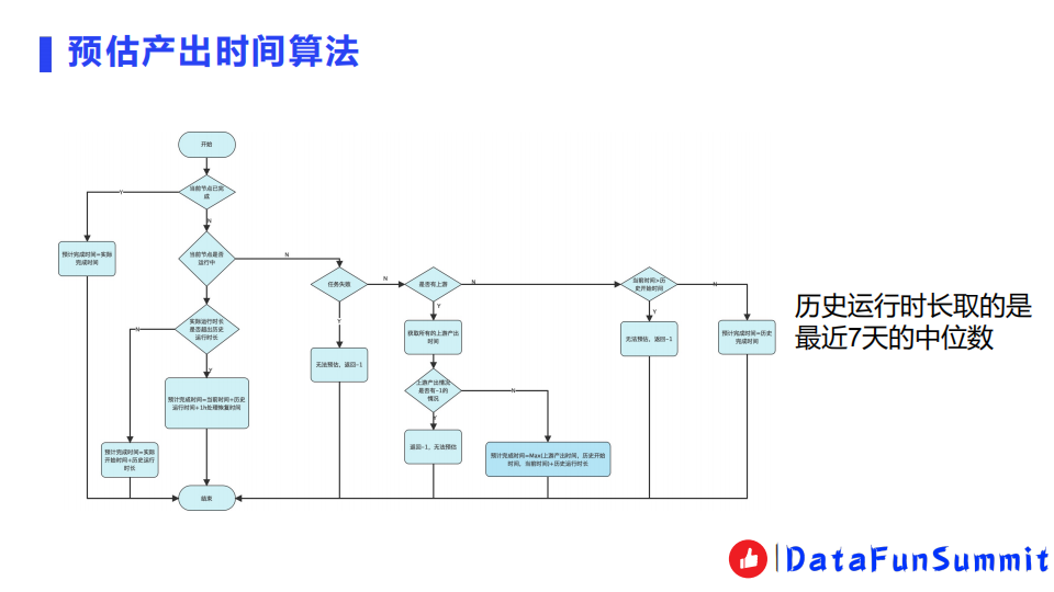 如果当前节点任务已经完成,预计完成时间=当前节点实际完成时间;如果当前节点尚未完成,则查看当前节点关联的任务是否正在运行,如果关联任务在运行中且时长严重超出历史运行时长,则预计完成时间=当前时间+历史运行时长+1h处理恢复时间,作为该表的预计完成时间,该公式是由有赞经常处理故障的数仓及其他人员共同商讨总结的算法;如果当前运行时长正常,则预计完成=实际开始时间+历史运行时长;如果当前节点已运行过但运行失败,无法预估产出时间,返回-1,需要人工重启;如果当前节点任务没有失败,并且不在运行中,表明该节点任务尚未运行,则查看是否存在上游节点,如果有上游,获取其上游所有节点的预计产出时间,如果上游有不可预估的情况,那么产出时间无法预估,返回-1;如果上游预计产出时间都可预估,则该节点的预计完成时间=Max(上游产出时间,历史开始时间,当前时间)+历史运行时长;如果没有上游,说明该节点为源头节点,如果当前时间>历史开始时间,说明节点未正常启动,无法预估产出时间,返回-1,需要人工启动发起调度;如果当前时间<历史开始时间,说明节点未调度,则预估完成时间=历史完成时间。