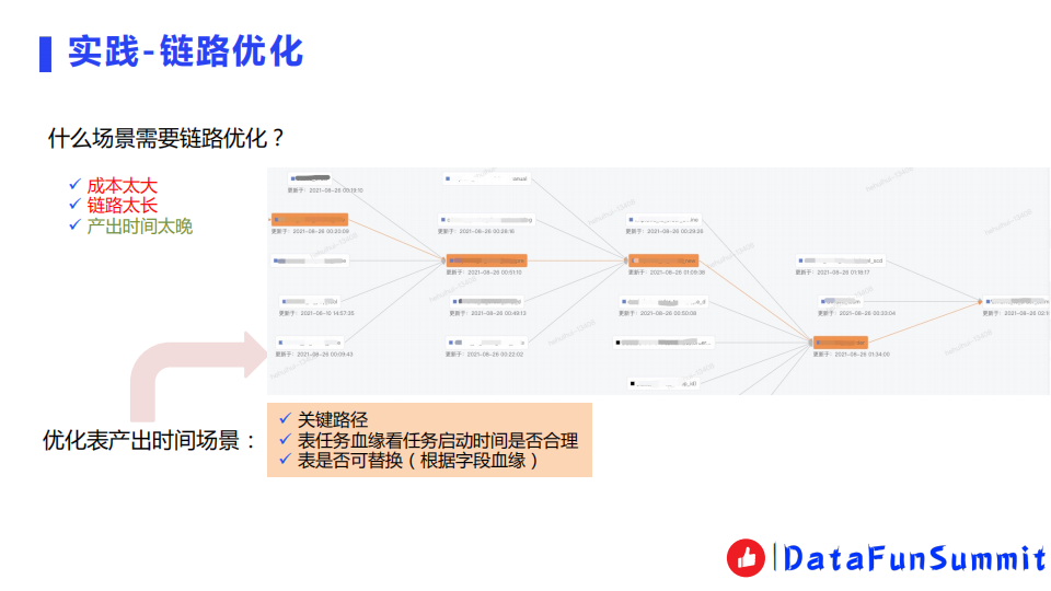如发现表无法优化了,可考虑表是否可以替换。根据字段血缘来看,产出最晚的上游表的被使用了哪些字段,根据字段血缘来看目标表是否用到这些字段,如果未使用相关字段,则可创建一个新表,将产出时间最晚的字段去掉,从而要目标表去引用新表,将最影响产出的字段去掉,达到链路优化目的。