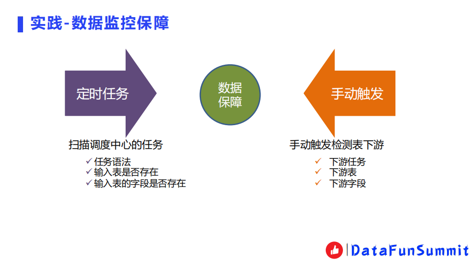 在上游发生变化时,如何通知下游?有赞有2个措施开展数据监控保障,包括定时任务和手动触发: