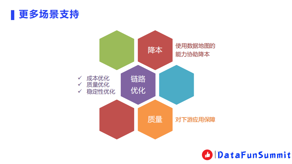 数据地图有更多的场景支持,比如,降本的工作;成本、质量、稳定性方面的链路优化,有更多场景来支撑;质量的保障,对下游应用的质量保障,可考虑使用数据专辑对数据地图数据进行批量保障,支持更多的链路场景。