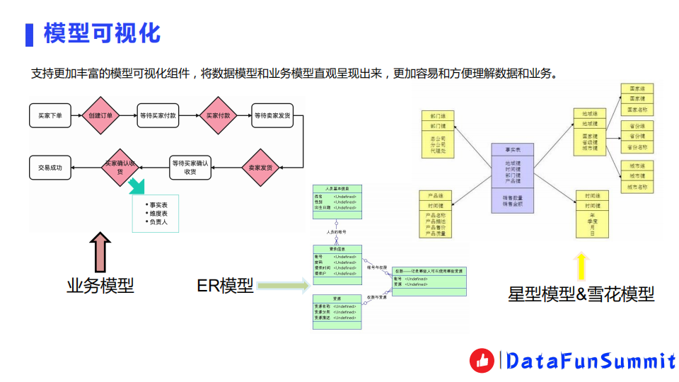 引用更多丰富的可视化组件,使数据模型和业务模型更直观地呈现出来,使理解数据和业务更加方便。业务模型可通过业务模型可视化实现对整个业务流程预览,每个业务过程都有对应的事实表、维度表、负责人等信息,在看数据和理解数据更加方便。比如有赞入职的新同学,对微商城业务及具体产品流程不了解,可通过业务模型可视化了解到:商家先浏览-再下单-等待商家支付-等待卖家发货-等待买家确认收货-交易成功,这个为微商城核心业务流程的链路,新同学看到这个业务模型,对有赞业务理解更加方便。ER模型是MySQL库模型的可视化。数据仓库中最常见的星型模型&雪花模型,可通过图形化的方式更加容易理解模型。