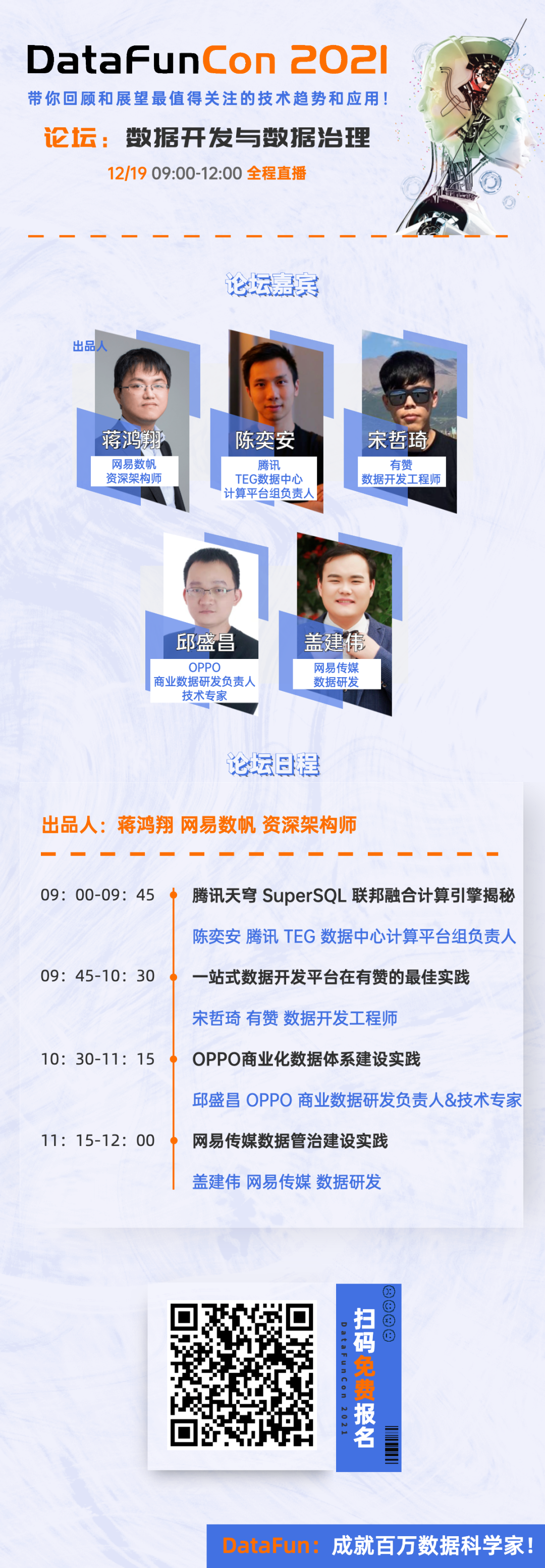 12月19日,在DataFunCon 2021年终大会上,由网易数帆资深架构师蒋鸿翔老师出品的数据开发与数据治理论坛,将邀请来自腾讯、有赞、OPPO、网易的5位嘉宾,为大家带来数据开发与数据治理的最新落地实践,感兴趣的小伙伴,欢迎识别二维码免费报名收看~
