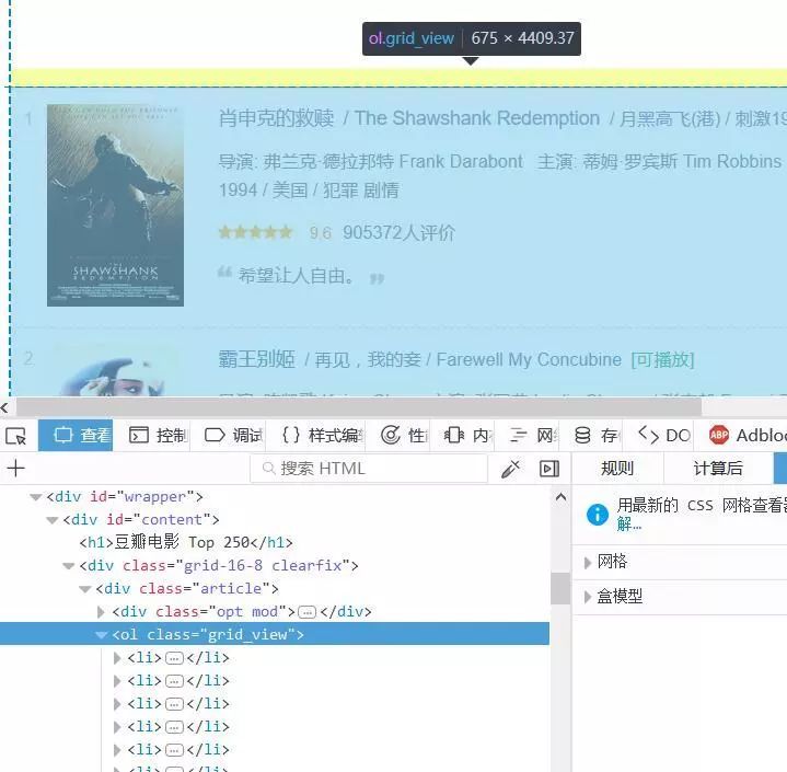 可知该页面下所有电影包含在 ol 标签下。每个 li 标签包含单个电影的内容。