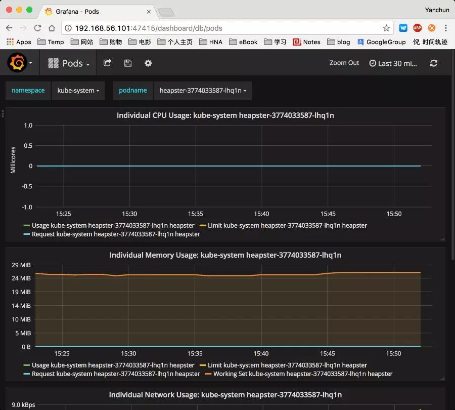 这里需要注意一个问题,如果你部署的 Kubernetes 集群没有创建证书,只有 http 的话,那 heapster 会因为证书找不到而启动失败,此时,可以将上面的 --source 改掉: