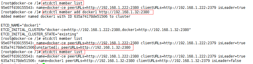 [root@docker1 /]# etcd --name docker1 --data-dir /etcd --initial-advertise-peer-urls http://192.168.1.32:2380 --listen-peer-urls http://192.168.1.32:2380 --listen-client-urls http://192.168.1.32:2379,http://127.0.0.1:2379 --advertise-client-urls http://192.168.1.32:2379 --initial-cluster-token etcd-cluster --initial-cluster docker-ce=http://192.168.1.222:2380,docker1=http://192.168.1.32:2380 --initial-cluster-state existing