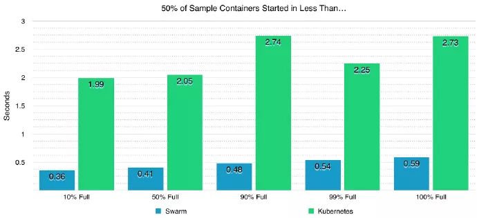 1.从性能看:房多多是自建机房,每一台物理机的利用率是比较高的。在我们测试调研过程中发现,Swarm通常可以在一秒内启动一台容器,调度效率和容器启动速度其实比 Kubernetes快很多。如下图(50%负载下,1000节点 启动每一个容器的平均时间):