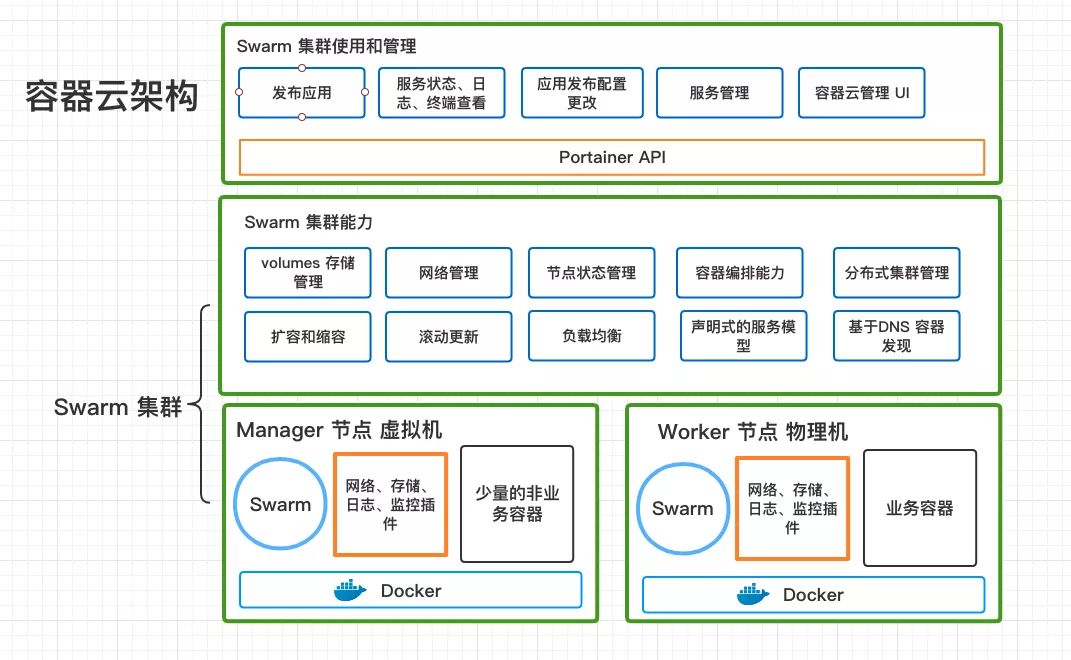 都加入到集群之后,Swarm 会提供网络管理、负载均衡、基于DNS容器发现、集群状态管理、扩容缩容等功能,我们在 DevOps 流程层面,可以组合成发布、回滚应用、查看服务的状态、日志、终端,更改发布配置(例如环境变量、默认副本数等)等功能。这个层面我们引入了 Portainer 这个开源项目,提供了更好用集群管理的 UI 界面和类似Kubernetes Apiserver 设计的 docker 集群 API 接口服务。