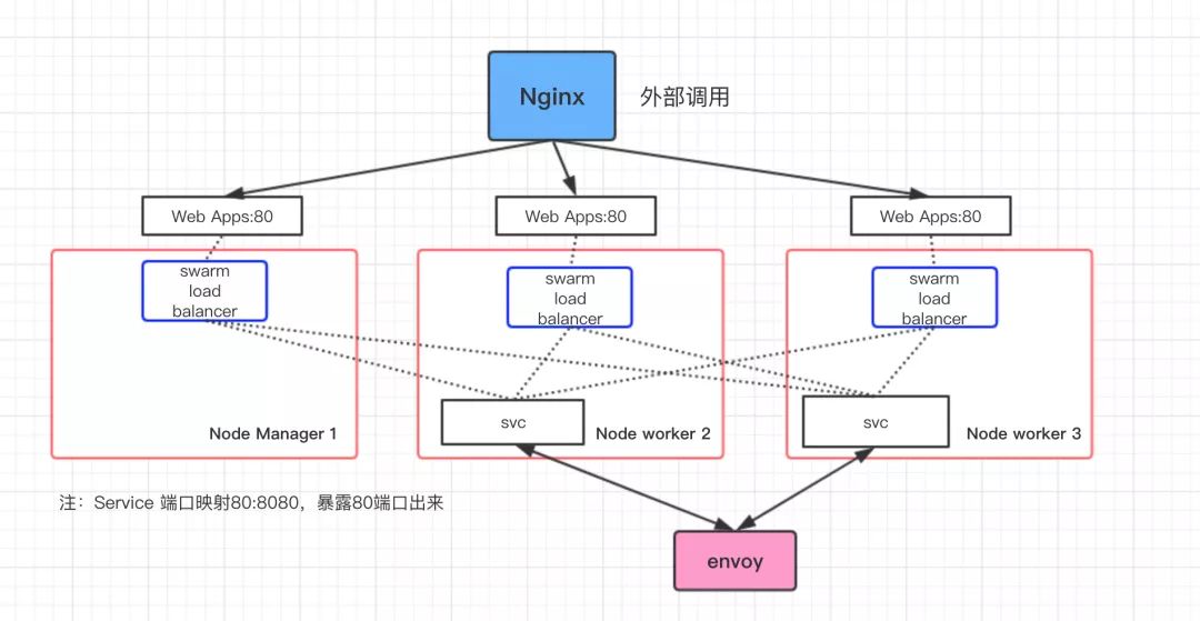 外部调用我们目前是通过 nginx 做反向代理到集群的节点,因为 ingress 的特性我们可以转发到任何一台 worker或者manager 节点上,然后通过内置的 routing mesh 的 load balancer 通过 LVS 转发请求到service 的其中一个副本,一个值得注意的点是,就算这台 node 上没有运行这个 service 的容器load balancer也会找到其他机器上存在的副本,这个主要是通过 内置的 DNS 加 LVS转发实现。