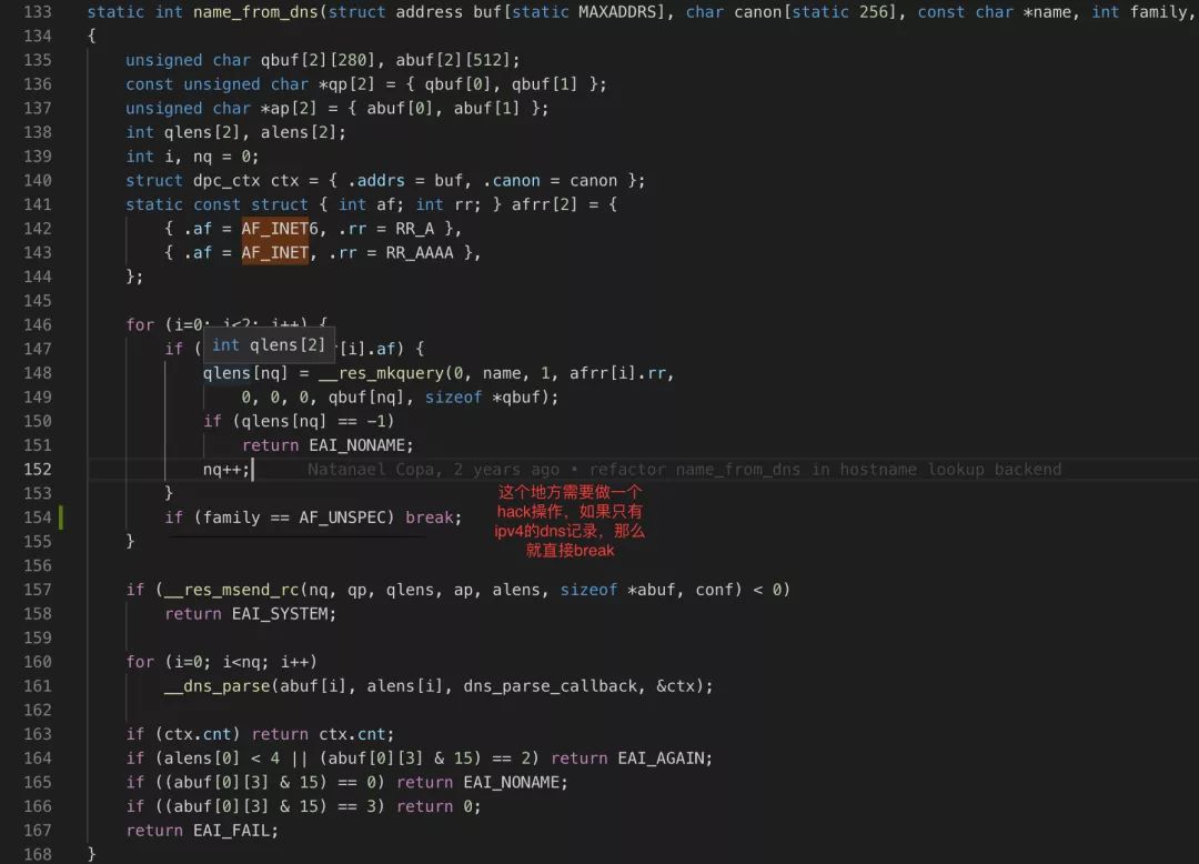 另一方面,musl的代码在dns解析的实现上有些问题,如果有ipv6的A记录那么解析性能不会出现问题,如果只有AAAA的ipv4记录,那么解析可能会出现卡死的情况,等待2.5s才返回,所以要添加一个break代码防止出现等待,在最新的 musl 的版本解决了(没有 发布,需要自行编译)