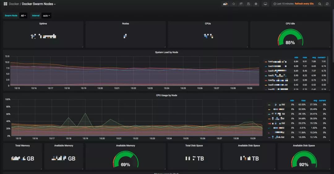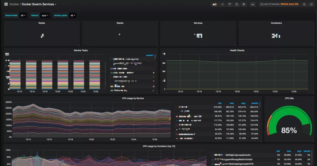 监控我们使用了 swarmprom 开源项目,监控项比较丰富,覆盖了机器基础指标,容器指标,可以较快的定位问题,当时当容器集群出现宕机等情况时,监控会暂时失效,所以我们在容器集群外也部署了针对机器的基础监控。具体效果如下: