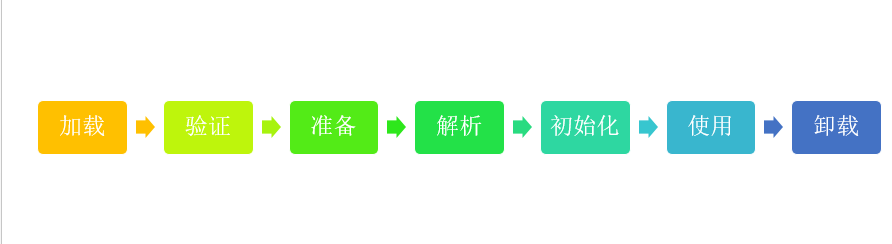 类从被加载到虚拟机内存中到卸载出内存为止的生命周期7个阶段:加载、连接(验证,准备,解析)、初始化、使用、卸载