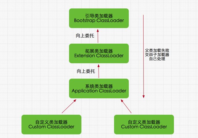 如果一个类加载器收到了类加载的请求,它首先不会自己去尝试加载这个类,而是把请求委托给父加载器去完成,依次向上,因此,所有的类加载请求最终都应该被传递到顶层的启动类加载器中,只有当父加载器在它的搜索范围中没有找到所需的类时,即无法完成该加载,子加载器才会尝试自己去加载该类