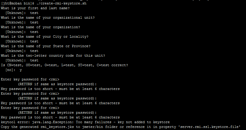 --这里报错的根本原因是,jmeter 4.0版本之后需要手动生成秘钥。执行./create-rmi-keystore.sh,按提示操作后生成rmi_keystore.jks,将生成的文件拷贝到所有Slave节点的bin目录下即可。