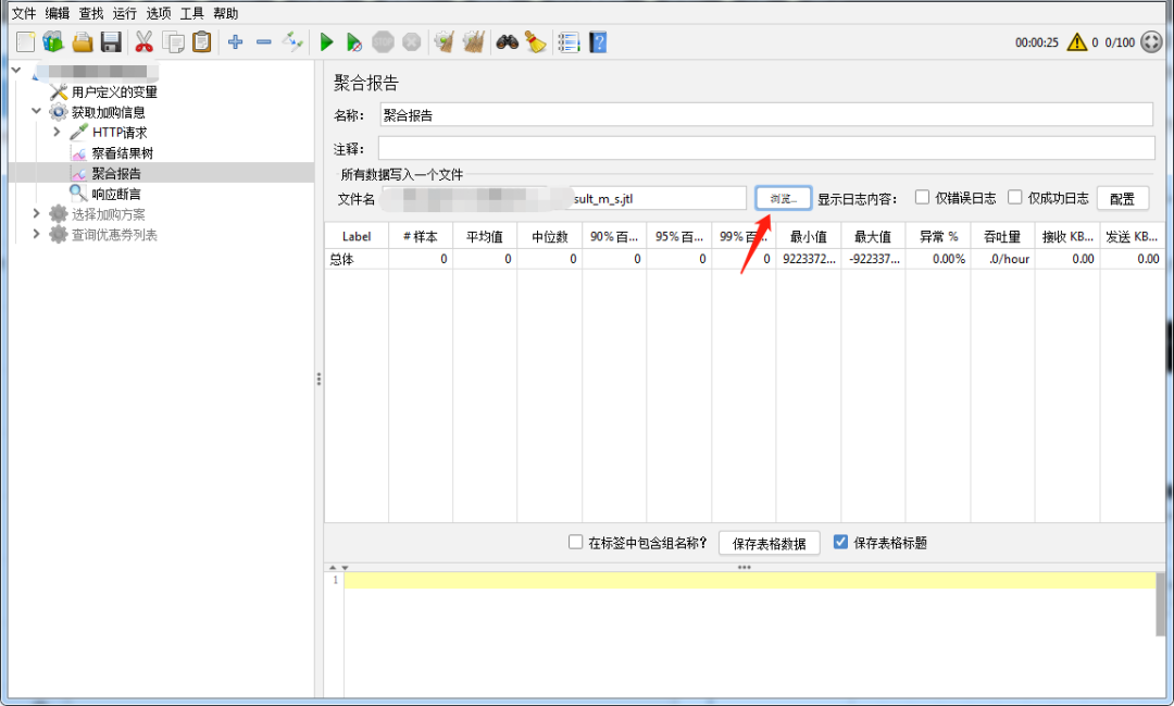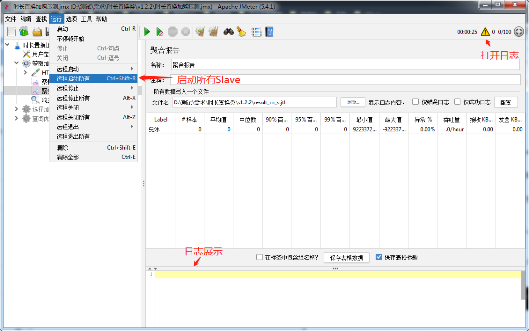 jmeter -n -t xxx.jmx -R 192.168.0.10,192.168.0.15 -l xxx.jtl -e -o xxx xxx.jmx为测试脚本,xxx.jtl为测试结果,xxx为测试报告文件夹(必须存在且不为空)远程启动所有Slave节点 jmeter -n -t xxx.jmx -r -l xxx.jtl -e -o xxx xxx.jmx为测试脚本,xxx.jtl为测试结果,xxx为测试报告文件夹(必须存在且不为空) Ⅲ. 等待所有Slave节点执行完成,将结果xxx.jht拷到Windows下,聚合报告选择浏览打开文件,就可以像UI模式下一样分析数据。
