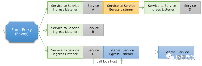 egress 部署模式话就是将 envoy 部署在外部,通过出入流量接口来实现对后端服务的访问,往往 egress 的 envoy 都是部署在用户的请求出口处