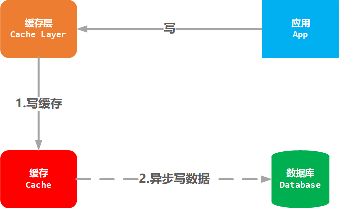 后端写模式,类似于穿透读写模式,最大的差异在写操作同步数据库时,会采用异步模式,也就是先快速写缓存返回,再异步同步数据库。这样提升了应用写操作的效率。很多应用都会采用这类技术优化,也被称为缓存预写或其他方式预写(文件预写,日志预写)。