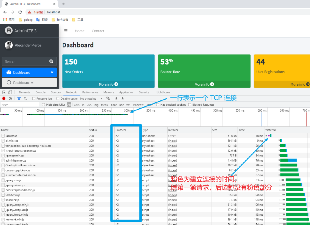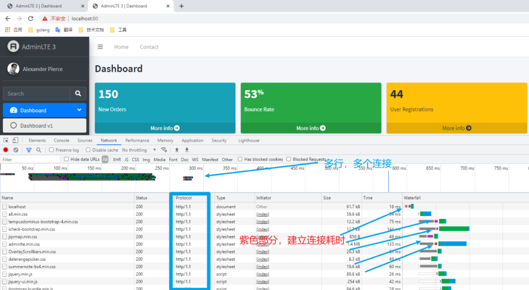 我们再通过浏览器的网络监控面板看一下,HTTP/1.1 和 HTTP/2 的连接情况: