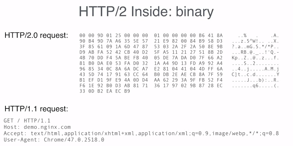 HTTP/2 在传输数据时,除了把数据切片为帧外,还会对数据进行二进制编码,无论是 Headers 还是 Body。对应的 HTTP/1.1 是采用字节编码。