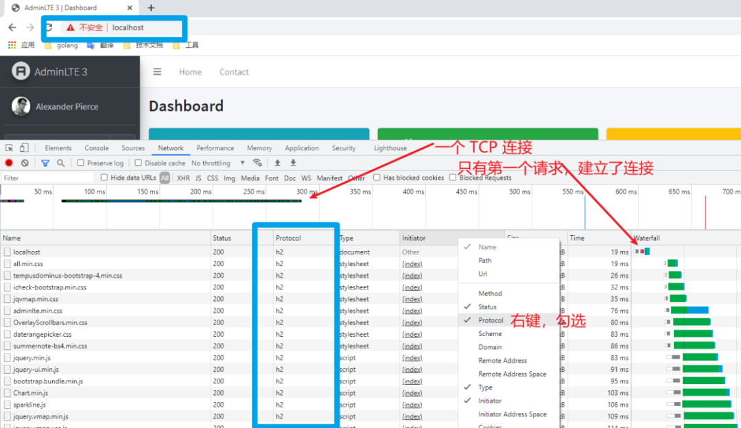 除了 h2 协议外,我们还可以看到,这么多请求,仅仅使用一个连接。