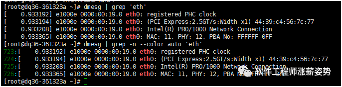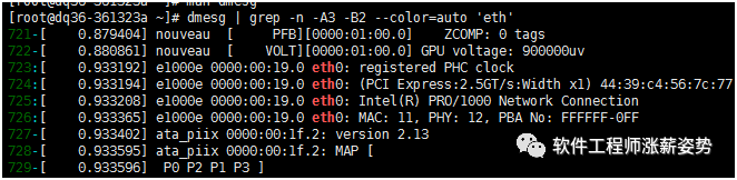 dmesg | grep -n -A3 -B2 --color=auto 'eth'