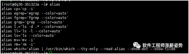 可以看到alias grep=’grep –color=auto’,所以第一幅图都有颜色