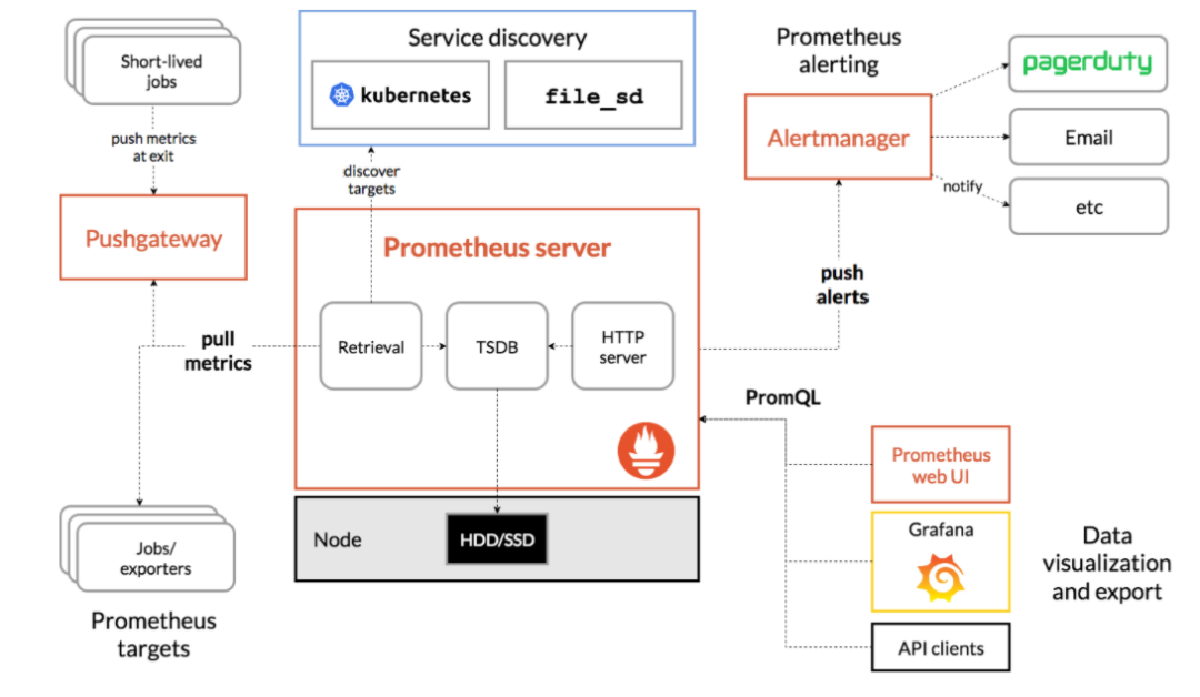Prometheus 直接或通过pushgateway抓取metrics。将数据存储在本地,并对这些数据运行规则,以便从现有数据聚合和记录新时间序列,或者生成警报。Grafana或其他API consumers可以用来将抓取的数据可视化。