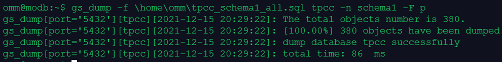 gs_dump -f \home\omm\tpcc_schema1_all.sql tpcc -n schema1 -F p