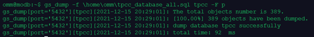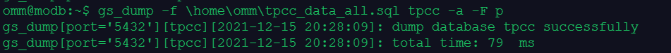 2.使用gs_dump工具以文本格式导出数据库tpcc的全量数据gs_dump -f \home\omm\tpcc_database_all.sql tpcc -F p