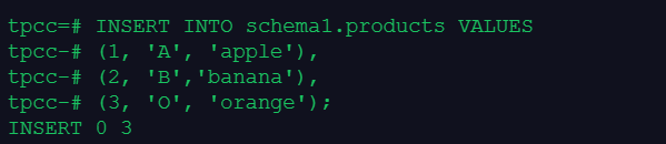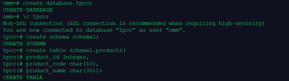 1.创建数据库tpcc,在数据库tpcc中创建模式schema1,在模式schema1中建表products