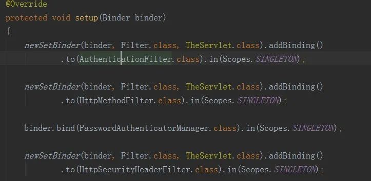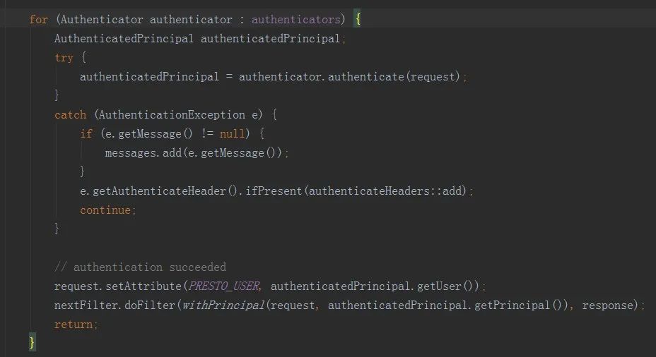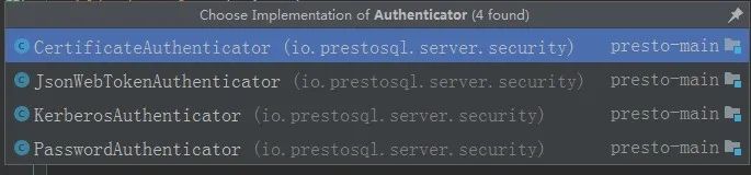 在openLooKeng的代码中认证相关的filter会在ServerSecurityModule类中进行注册,AuthenticationFilter和PaswordAuthenticatorManager就是跟认证相关的。