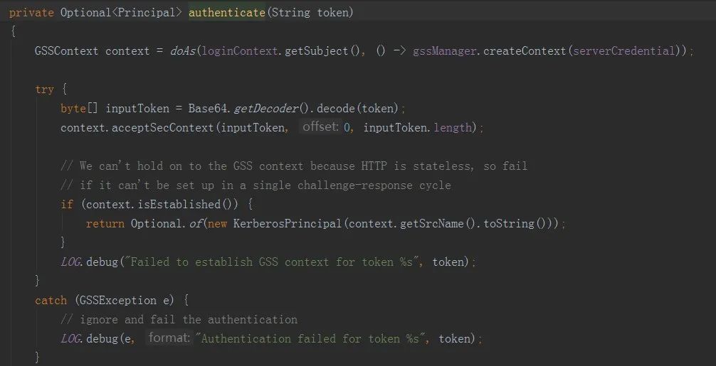 Kerberos认证主要在KerberosAuthenticator类中完成的,在类初始化的时候会根据配置的信息如krb5.conf、keytab和principal等信息初始化好loginContext。当有请求带来时,会从request中取出用户信息或是token进行认证,如下: