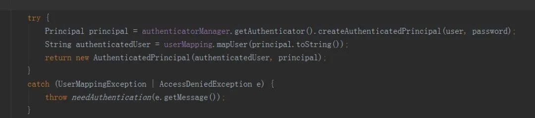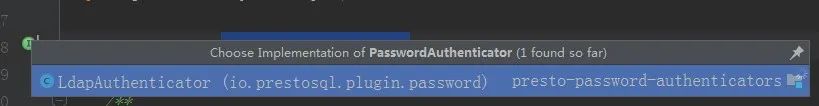 而LdapAutehnticatorFactory类则是实现了PasswordAuthenticatorFactory接口,该接口主要提供了两个方法一个getName和create,其中在LdapAuthenticatorFactory中getName返回的是ldap,以区别其他密码认证模式,create方法中则是通过airlift框架初始化LdapAuthenticator实例,保存在PasswordAuthenticatorManager类中,这样当进行密码认证的时候从该类中取出对应的Authenticator实例即可。