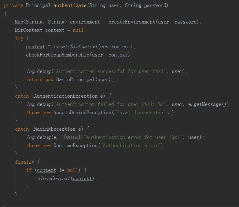 在LdapAuthenticator类中认证主要由authenticate方法完成的。里面会调用LDAP相关的API跟LDAP服务器进行交互完成认证。