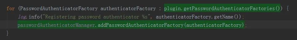 另外在系统启动的时候,会由PasswordAuthenticatorManager调用addPasswordAuthenticatorFactory接口加载多个PasswordAuthenticatorFactory实现类,如下: