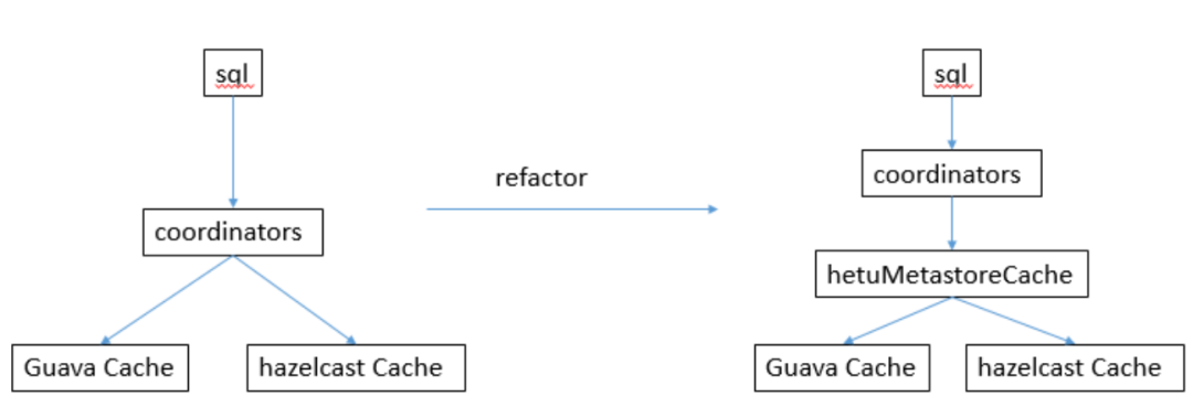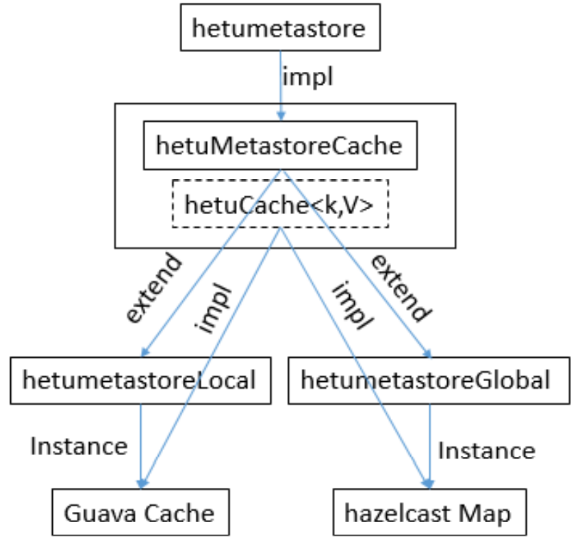 对外暴露接口要统一HetuMetastoreCache ,而且需要对声明变量进行初始化。解决办法:善于应用继承Extends;Guava Cache和Hazelcast Cache继承HetuMetastoreCache这个接口。这里面用到Cache变量又要统一使用Hetucache,Hetucache有两种模式Guava的Cache和Hazelcast的Map。