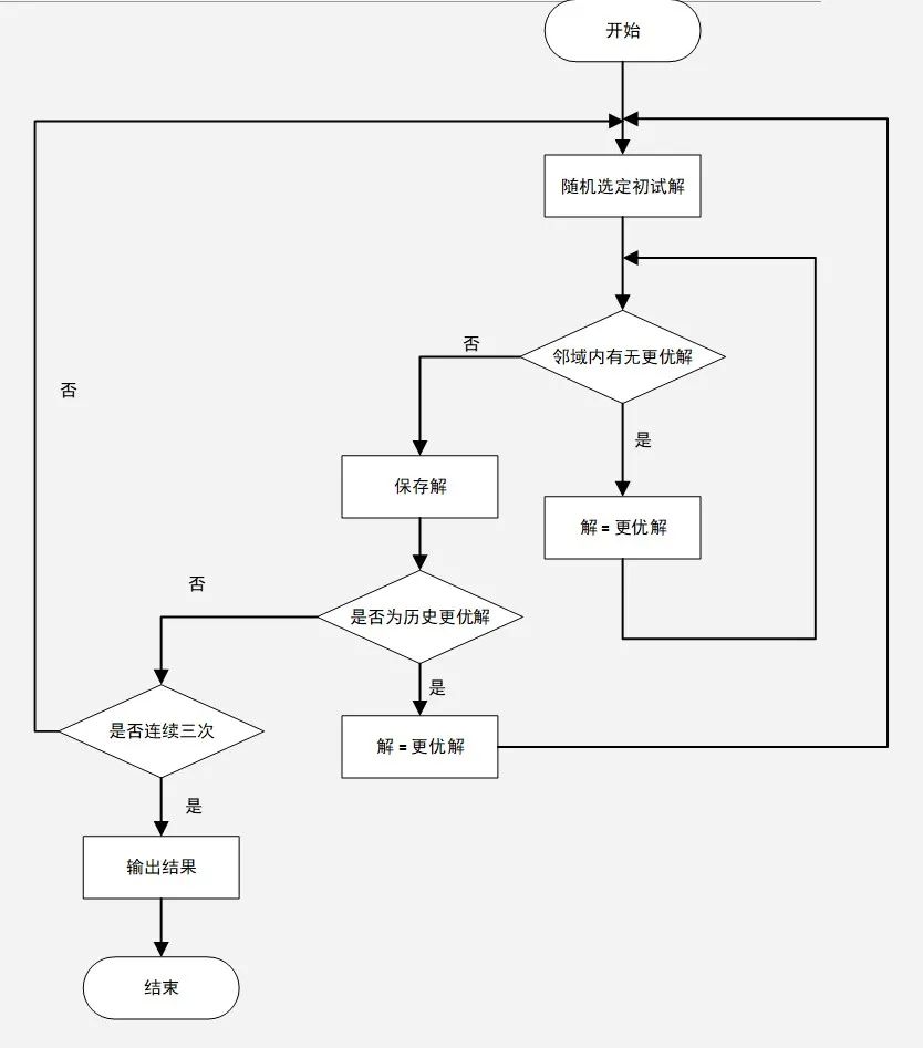 算法是在爬山算法的基础上运行多次,直到连续三次收敛到的局部最优解都不比之前搜索到的最优解更优,则结束搜索,并认为当前最优解即是我们需要的最优解。