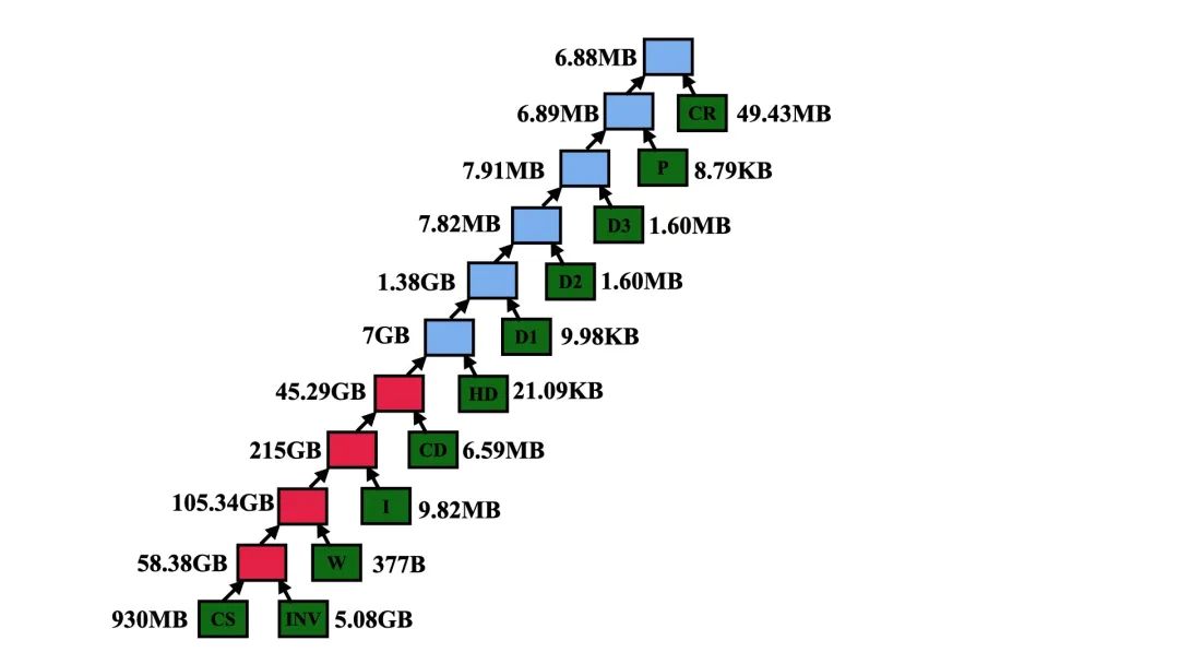 以Query72为例:Query72涉及10张表的联表查询,而openLooKeng选择保留其原有连接计算顺序,这样带来的后果就是其中部分连接操作吞吐量过大:如图2所示,中间数据量最高可达215GB,而实际最终吞吐量仅为6.88MB,其中包含大量远超实际需求的计算开销。