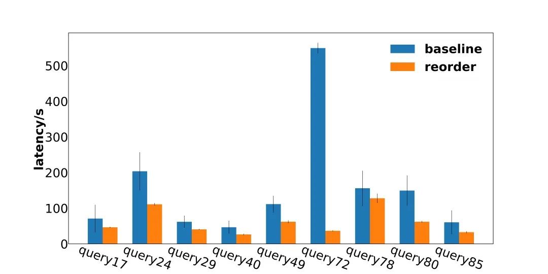 重排后的部分Query的性能结果如图6所示。可以看到,对于优化目标左深树中最典型的例子Query72,其运行耗时从原来的530秒下降到了现在的40秒,性能提高了12倍。