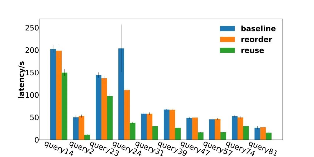 在重排的基础上加上了复用之后的效果如图7,可以看到对于Query2和24来说,性能提升到了原来的5倍左右。
