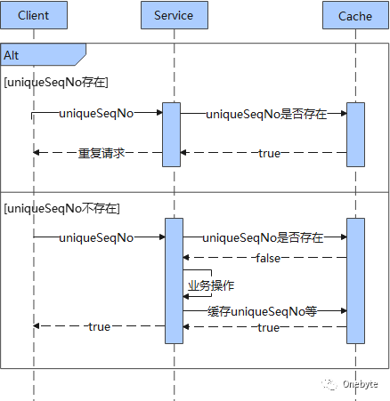 服务提供方(服务端)判断uniqueSeqNo是否存在,若存在,则认为是重复请求,抛出异常;