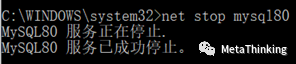 (1)使用管理者权限启动cmd命令窗口,在命令窗口中输入“net stop mysql80”,如果提示MySQL:net start MySQL80:发生系统错误 5。拒绝访问。说明没有以管理员身份运行。