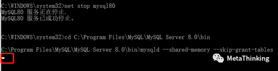 4.2、以上条件满足之后,设置免密密码,在控制台中输入mysqld--shared-memory --skip-grant-tables