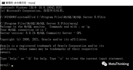 3、在控制台窗口中进入mysql的bin文件夹下,在控制台输入 cd 空格 路径,比如:cd C:\ProgramFiles\MySQL\MySQL Server 8.0\bin