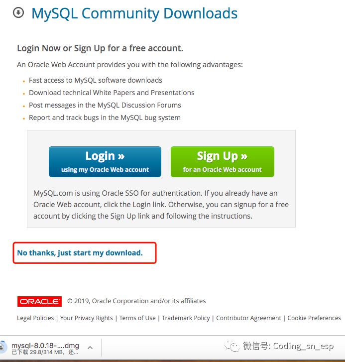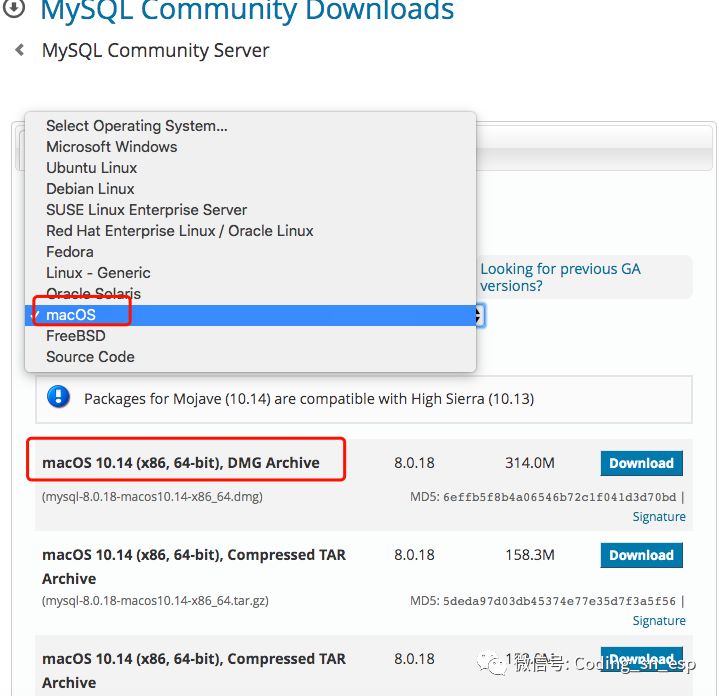 (1)打开“https://dev.mysql.com/downloads/mysql/“网址,选择“macOS”,在打算安装的版本上点“Download”按钮