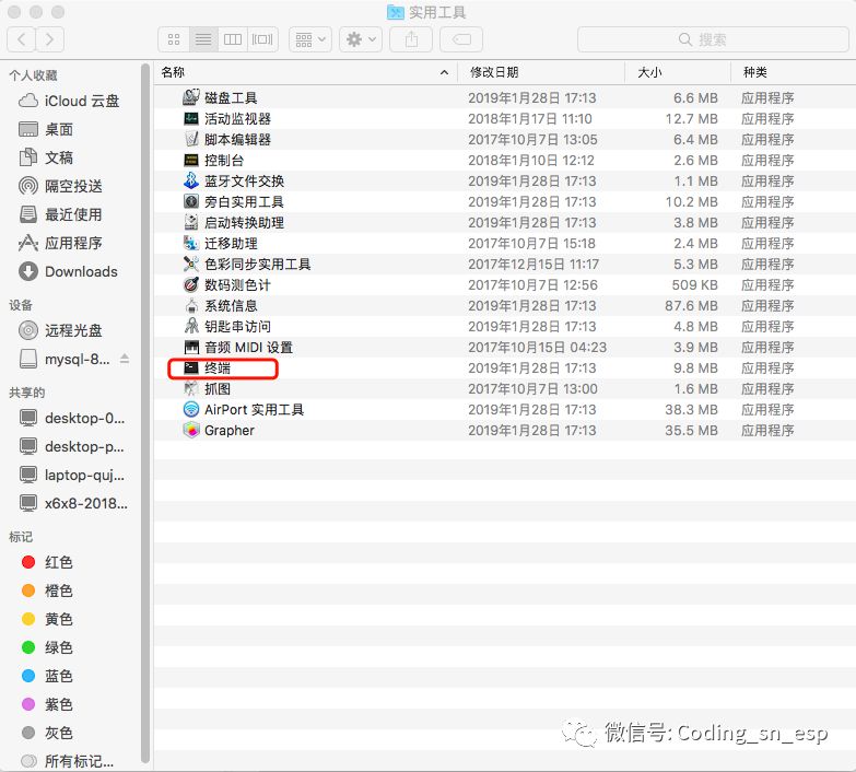 (4)打开“终端”工具配置MySQL环境变量,“前往” --> “实用工具” --> "终端"