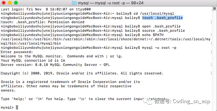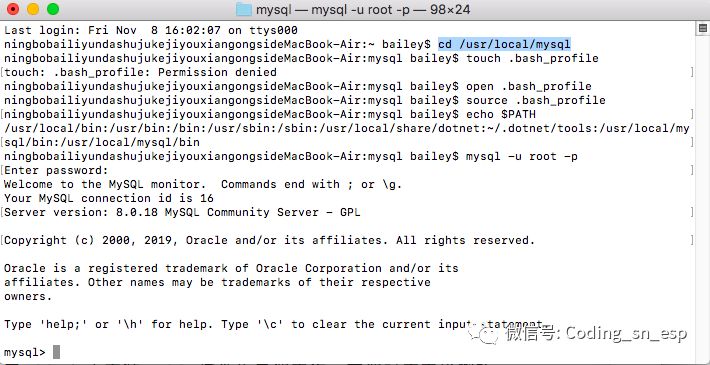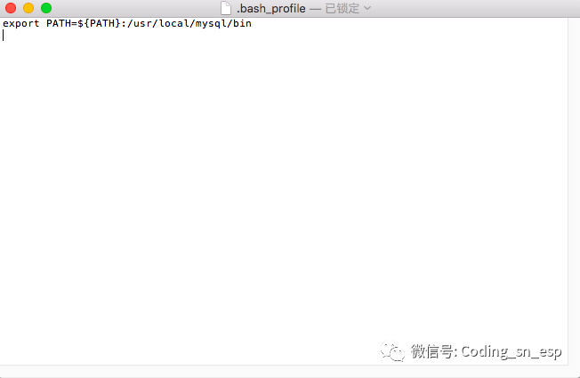 (7)在终端中输入“open .bash_profile”命令后,按“回车”键,在新打开的【终端】中配置 export PATH=${PATH}:/usr/local/mysql/bin 添加配置变量,Command+S 保存;