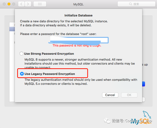 ③输入新密码,一定要记住这个密码(否则日后登录不了),用于后期链接数据库的登陆使用,并选择‘Use legacy password‘,单击“OK”按钮