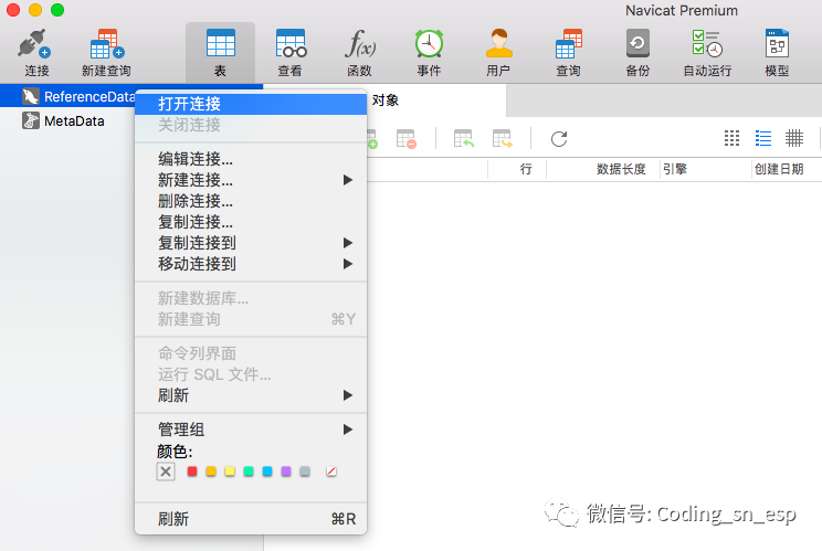 (5)让我们接着使用Navicat Premium连接MySQL,打开Navicat Premium工具主界面,在上面保存的“ReferenceData”连接上单击鼠标右键,选择“打开连接”